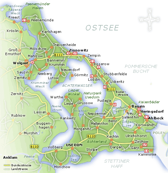 Vor Ort sind Supermärkte, Banken Apotheke, Bäcker und Restaurant alles fußläufig zu erreichen. Die gesamte Insel hat ein super Radwegenetz bis ins benachbarte Swinemünde (Polen) und liegt ca. 20 km vom feinsandigen Ostseestrand entfernt. Es gibt viele sehenswerte Attraktionen auf der Insel, wie z. B. die Schmetterlingsfarm, das Papageienhaus, das kulturhistorische Museum Peenemünde, tolle Jeep-Safaris über die Insel, Minigolf und entspannte Strandspaziergänge uvm.