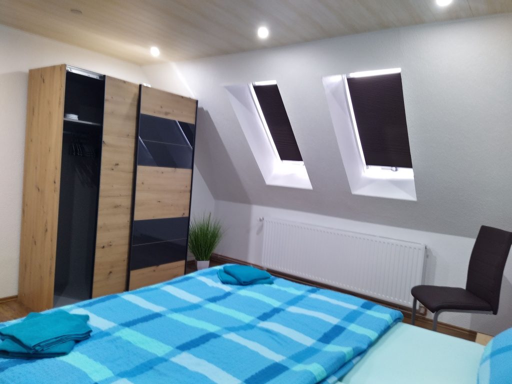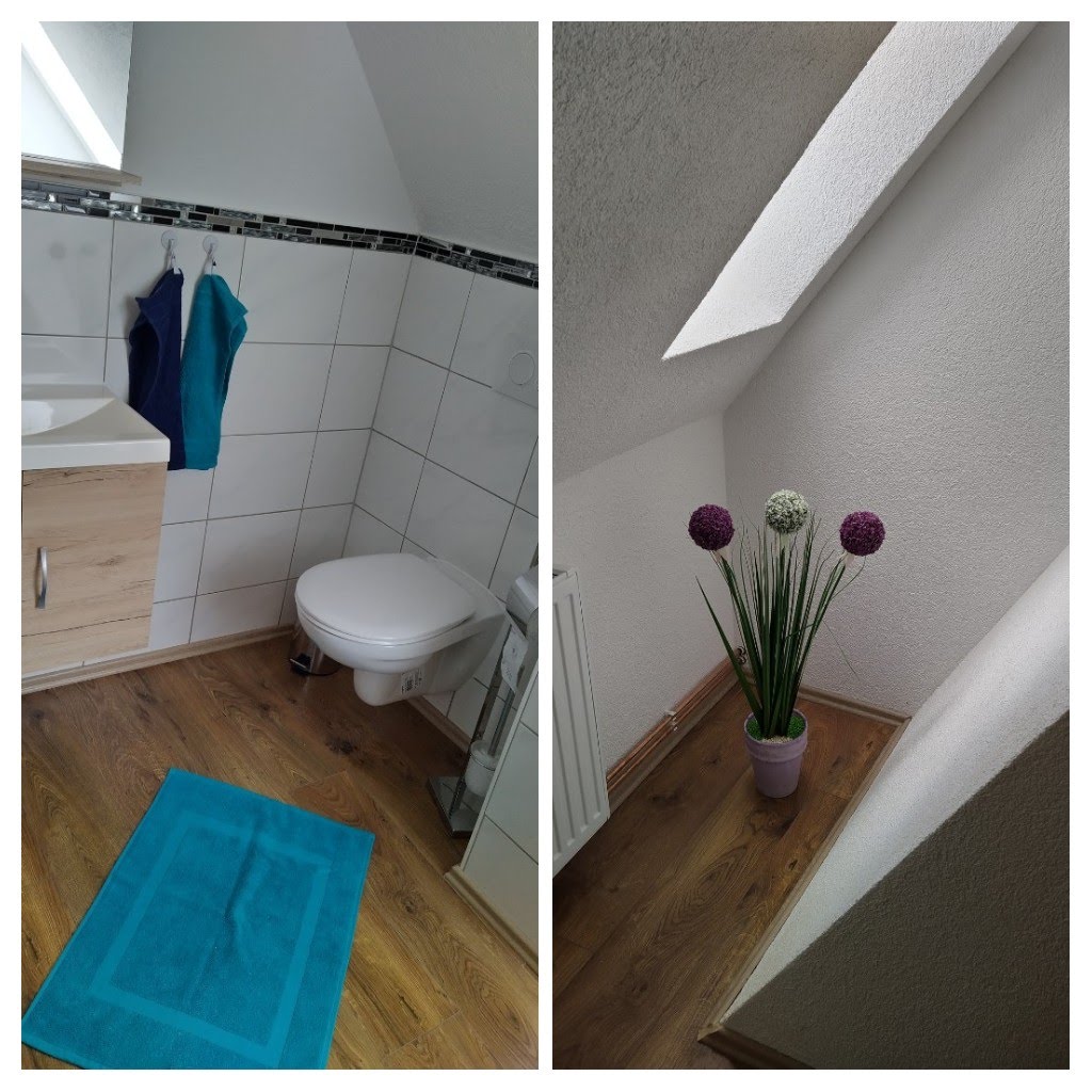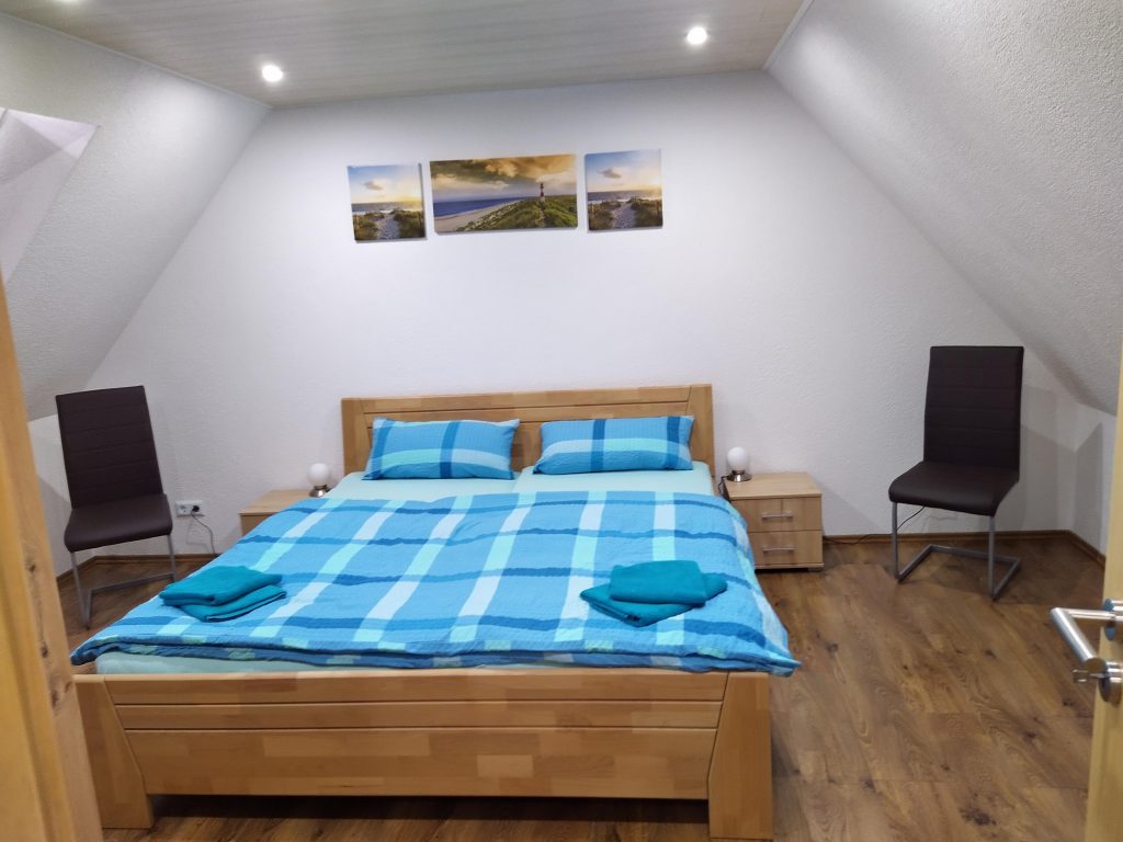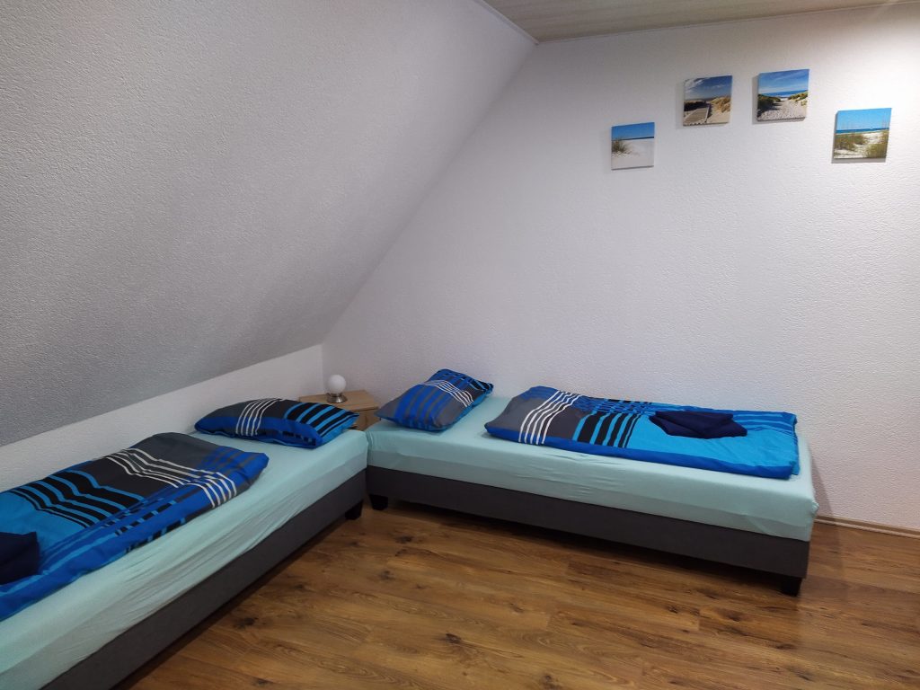 Obergeschoß befinden sich zwei Zimmer, davon eins mit Doppelbett und ein Zimmer mit zwei einzelnen Liegen sowie eine Gästetoilette