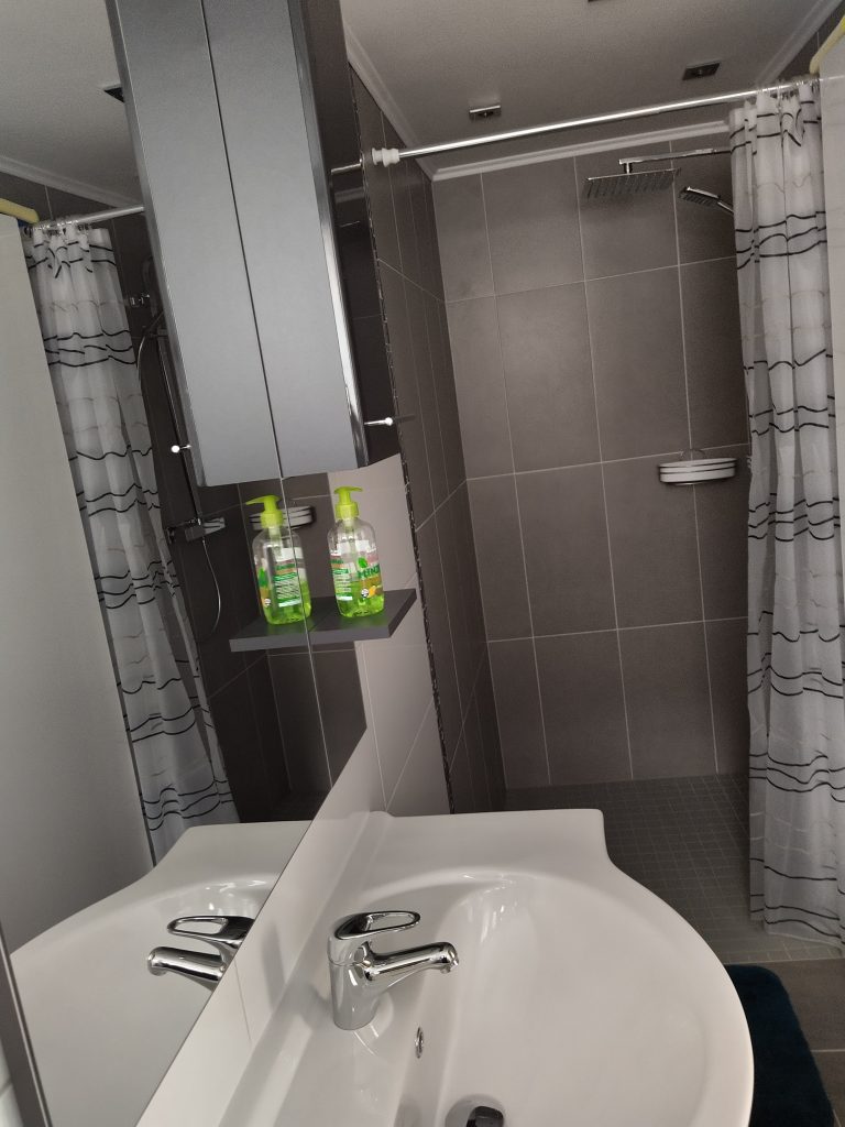 im Erdgeschoß befindet sich die offene Küche mit Wohn- und Essbereich sowie das Bad mit Dusche, im Wohnbereich kann ein Schlafsofa (150 x 220 cm) als Aufbettung genutzt werden.