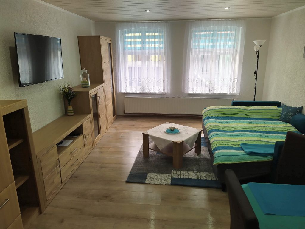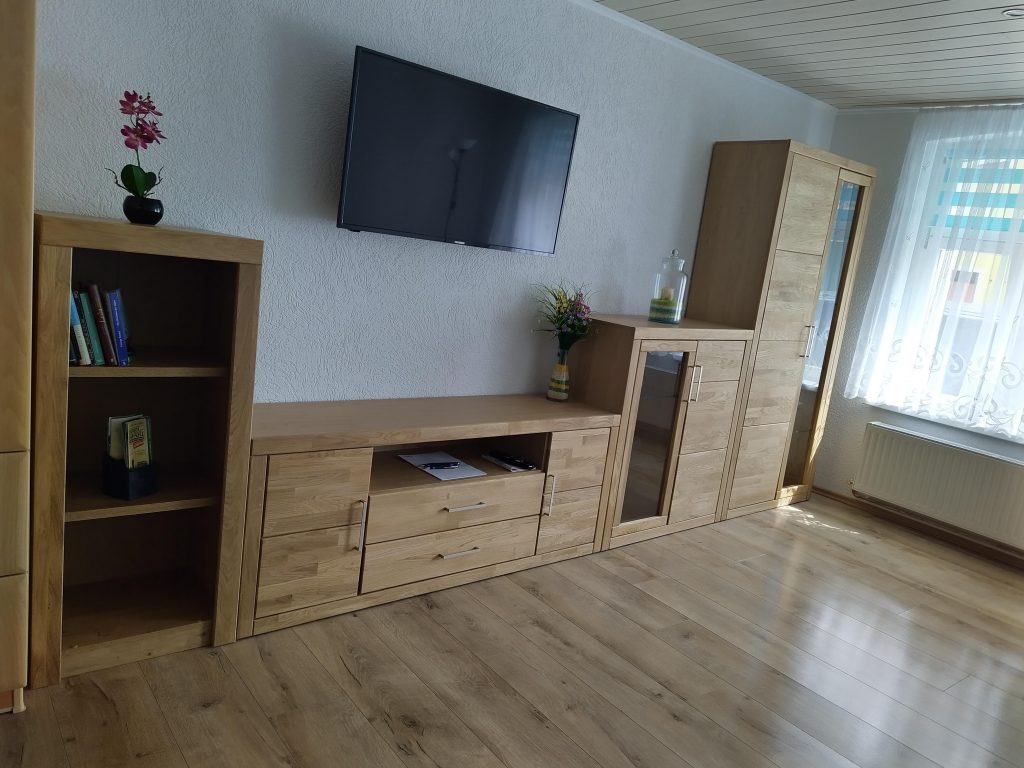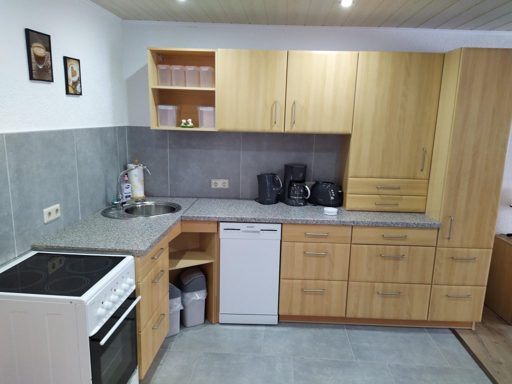 Ein Schlafsofa 150 x 220 cm, TV, Essbereich, Badzimmer mit WC, Dusche, Fön und eine komplett ausgestattete Küche mit Kühlschrank, Mikrowelle, Backofen, Ceranherd, Geschirrspüler usw.